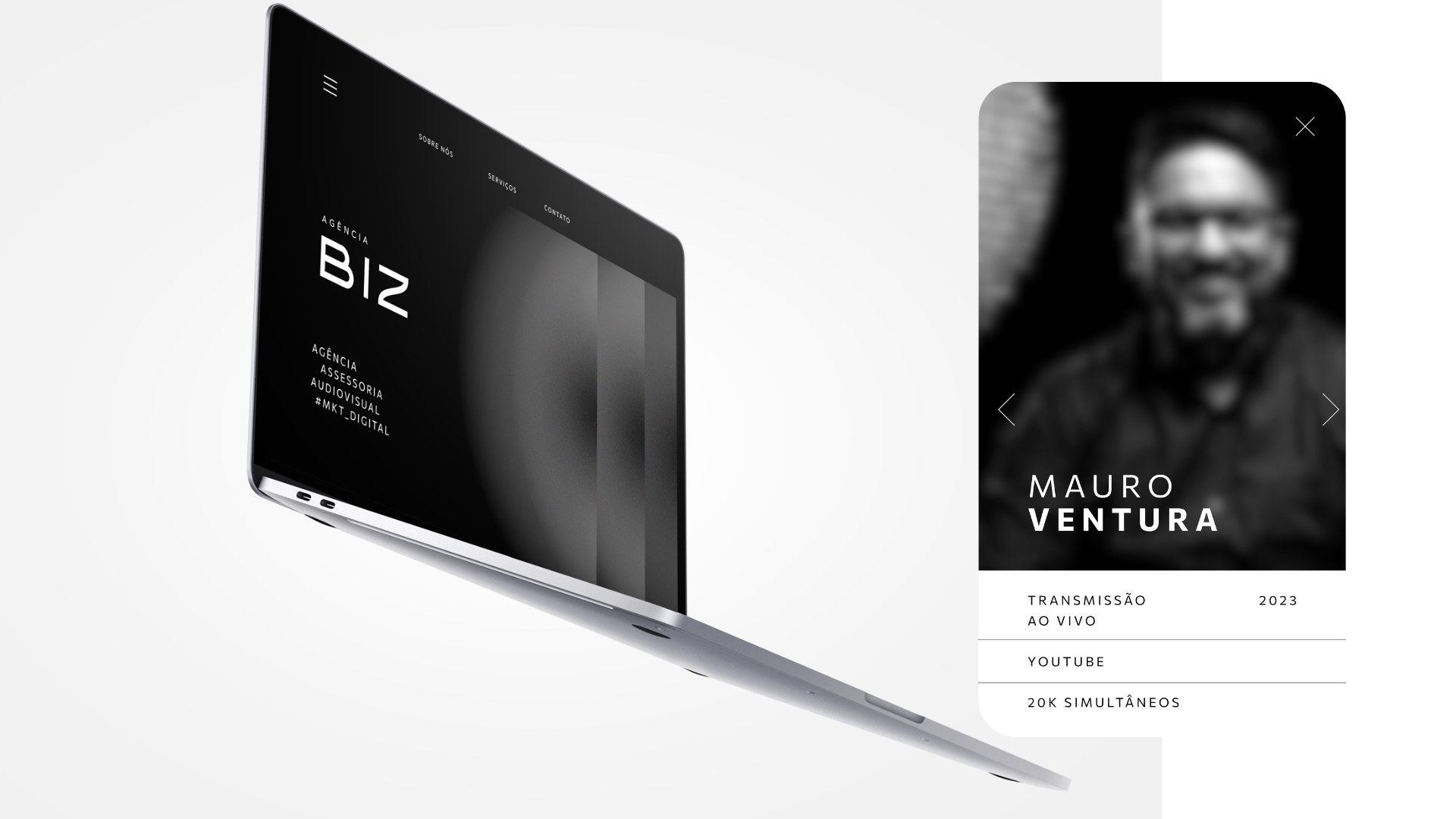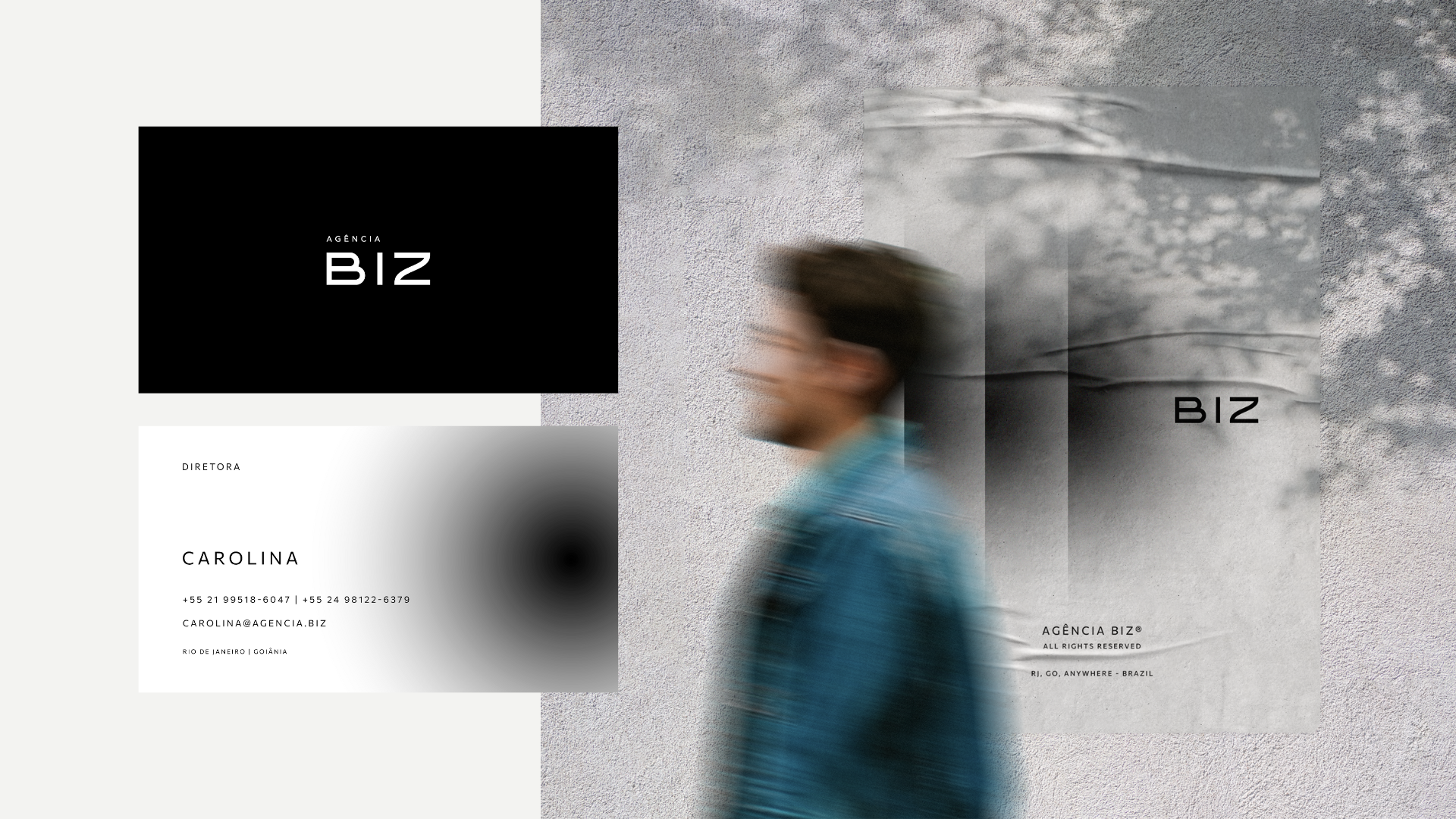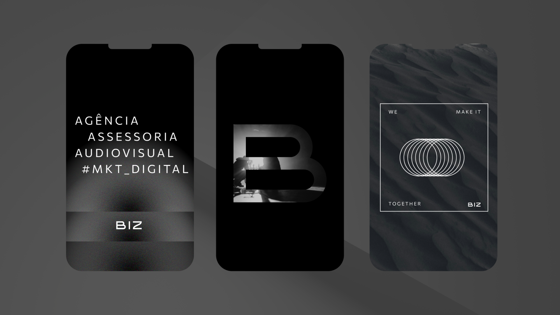 A Agência Biz é uma produtora que cria soluções digitais, de mídia online e produção audiovisual a gestão de redes sociais e análise de dados. Um dos conceitos escolhidos para a construção da identidade visual foi “mistério”. Mergulhamos nessa ideia, explorando tons de preto e cinza, refletindo o cenário técnico onde as estrelas se destacam: os clientes e suas histórias. Imagens texturizadas, desfocadas e em movimento ajudam a compor essa linguagem mais dramática e cheia de personalidade.